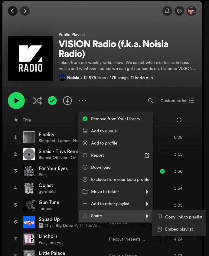 A playlist’s URL can be retrieved many ways in the Spotify desktop/mobile apps via the “share” buttons: