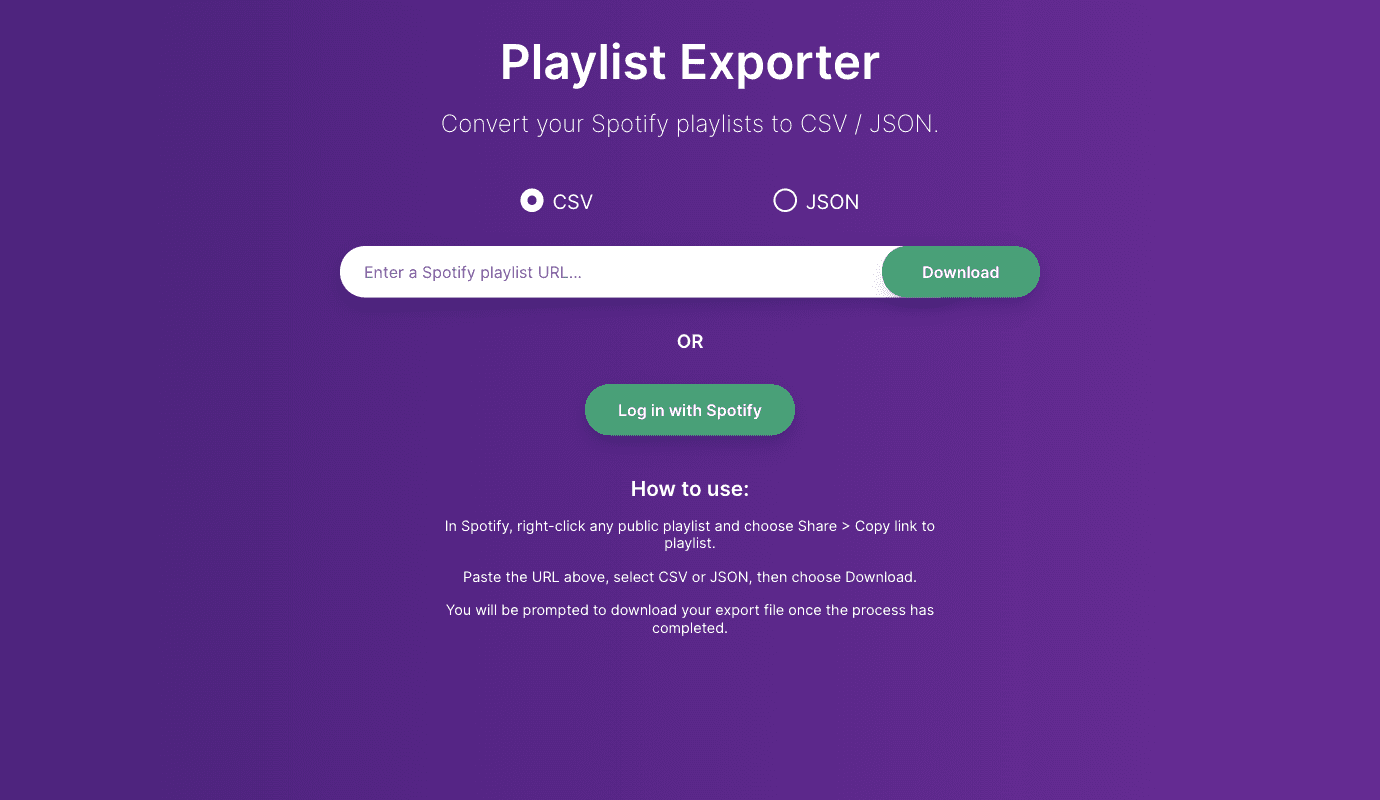 If Exportify matches a public playlist, the user can choose to export a list of songs within the playlist to a CSV or JSON file download: